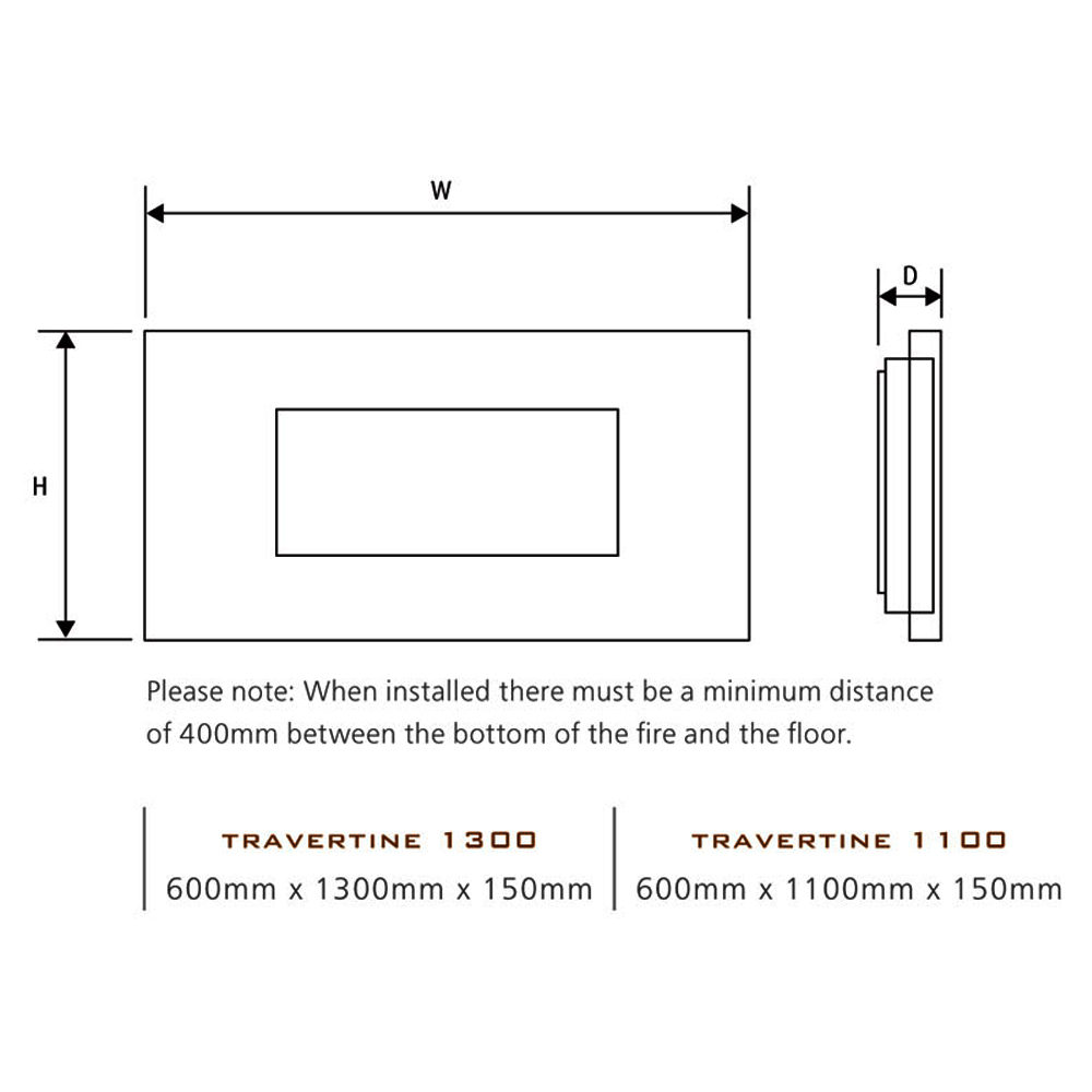 PLEASE NOTE WHEN INSTALLED THERE MUST BE A MINIMUM DISTANCE OF 400mm BETWEEN THE BOTTOM OF THE FIRE AND THE FLOOR.