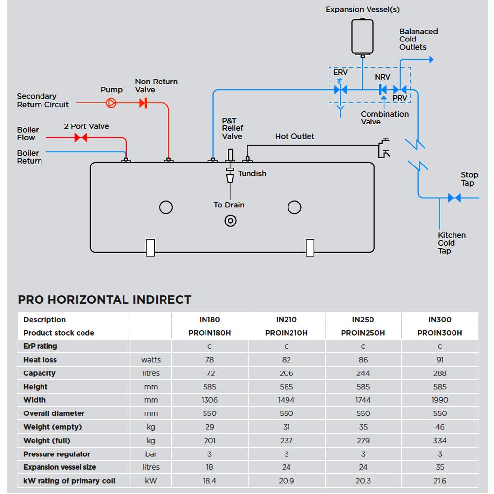 Gledhill Pro Horizontal indirect is an unvented hot water storage cylinder and is provided with a high efficiency internal primary coil which is designed for use with a gas or oil boiler and is suitable for both open vented and sealed pumped primary systems.