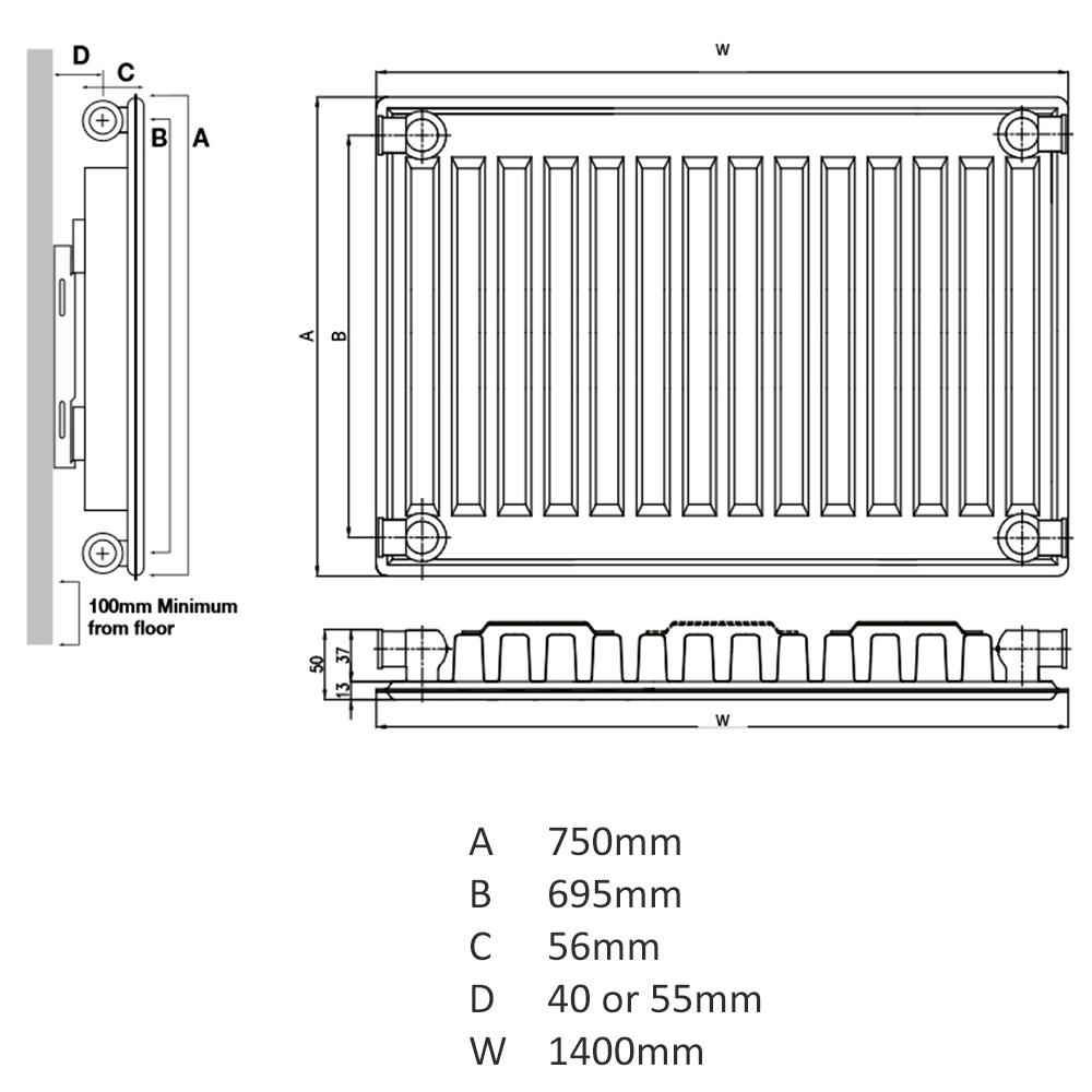 - Size – 750 High x 1400 Wide Type 11 / Single Convector K1